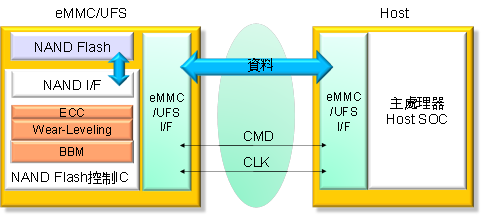 而主處理器(Host Processor)藉eMMC/UFS 通訊接口就可傳輸指令,不需針對錯誤檢查校正(ECC)、平均抹寫儲存區(qū)塊技術(Wear-Leveling)、故障區(qū)塊管理(BBM)等內存演算進行調校設計,因為這部分多由eMMC/UFS芯片內部控制IC完成,對行動裝置廠商而言,最大利基為可有效降低研發(fā)成本、加速自家產品上市時間。